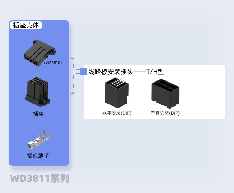 WD3810、WD3811系列是一款線對板、線對線連接器。3.81mm間距緊湊的設計,配合垂直、水平兩種出線方向,適應高密度PCB布局,助力設備小型化。